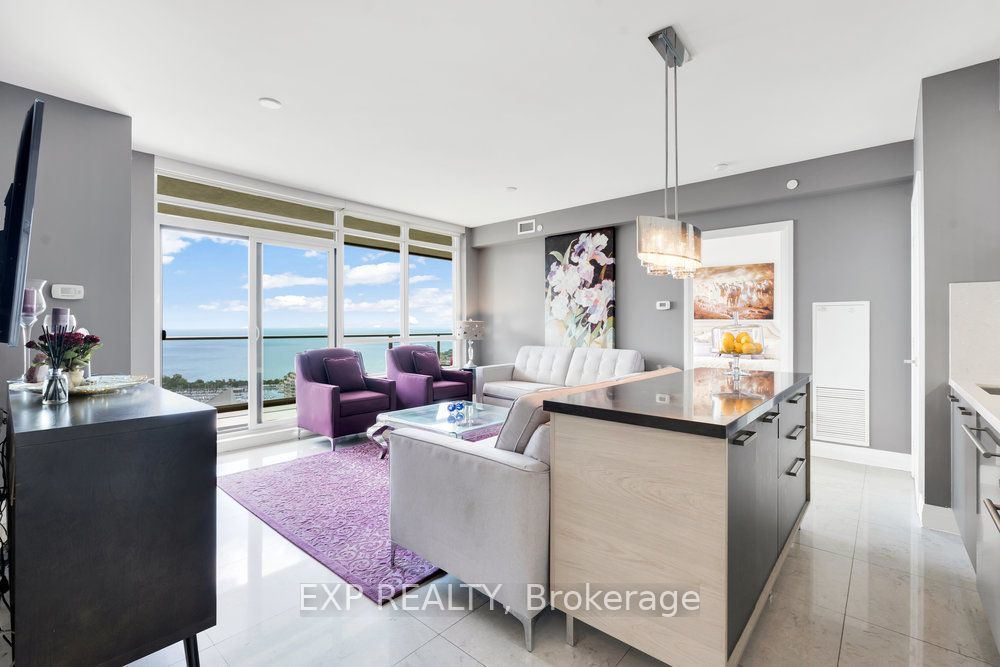 Rare turn-key opportunity at Key West Condos! This fully furnished corner suite in South Etobicokes waterfront enclave is a one-of-a-kind gem, upgraded and meticulously maintained by the original owner. Floor-to-ceiling windows flood the space with natural light and frame stunning southwest views of Lake Ontario, sunsets, and the city skyline. Professionally redesigned by the builder, the original second bedroom was transformed into a spacious formal dining room, a rare layout ideal for entertaining. The second bathroom was thoughtfully modified into a powder room, enhancing both flow and function. The original owner invested significantly in premium upgrades, including elegant chandeliers, designer light fixtures, and luxurious porcelain flooring, a timeless and rare finish that amplifies natural light and adds a refined, designer feel to the space. Two independently controlled HVAC thermostats ensure personalized comfort in each zone. Furnished with a curated mix of vintage and contemporary pieces, the suite blends timeless elegance with modern comfort. The serene primary bedroom features a walk-in closet, a private ensuite and peaceful lake views right from the bed. Step onto the expansive balcony to unwind or entertain, surrounded by open skies and calming water vistas. VIP parking on P1 next to the elevator and a convenient storage locker complete this offering. Nestled near Humber Bay parks, trails, cafes, transit, and with quick access to downtown, this is executive waterfront living at its best. Just bring your suitcase!!! This one-of-a-kind residence won't last! Book your private viewing today!
