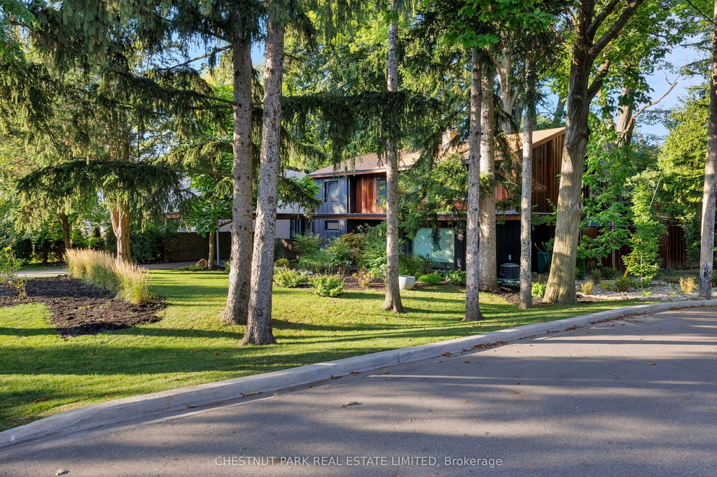 Architectural jewel in The Kingsway! Mid-century framework, Bauhaus clarity, and a setting that steals the show. Set on a ravine-kissed, cul-de-sac corner lot - 60 feet at the street widening to nearly 134 at the back - the property feels like a boutique spa submersed in nature: terraced gardens, multiple outdoor living zones, a sauna, and a cold plunge. You forget the city, even as Humbertowns renewed shops and Royal York & Bloor sit minutes away. Inside, light pours through floor-to-ceiling windows, framing gardens and wooded vistas. A floating staircase anchors the foyer; cedar-lined ceilings and oak floors bring warmth and texture. Sightlines, symmetry, and quiet discipline guide the plan - function meeting form without fuss. The main-level retreat opens directly to the landscape, complete with dual custom walk-ins and a spa-calibre ensuite. Above, a modernist kitchen with marble counters and custom cabinetry flows into dining and living, punctuated by a granite fireplace and dramatic glass wall pivots to the outdoors. Every space feels intentional; every detail, considered. Not just a house, but an authentic expression of mid-century living - embracing light, celebrating landscape, and inviting creativity. For the design-minded who believe home should inspire, 57 Wimbleton is a residence of rare poise, shaped by light and nature.