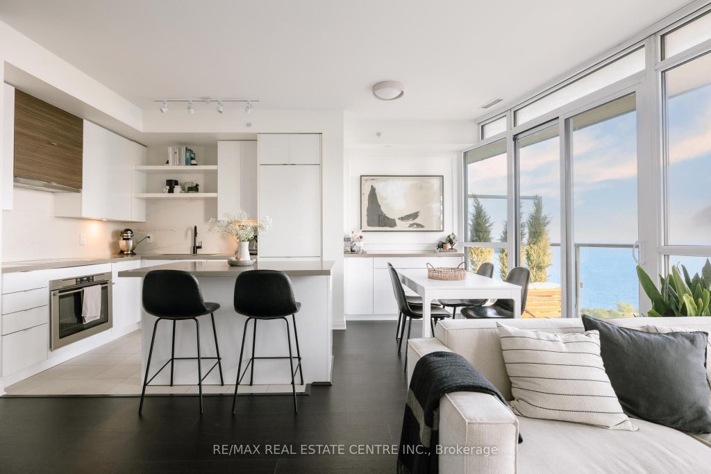 Protected Panoramic Views with Lakefront Luxury! Live in one of Humber Bays most coveted waterfront residences, Ocean Club. This rare 2-bedroom, 2-bath condo with 2 side-by-side parking spots blends modern design and functional luxury. The oversized kitchen with island features an integrated full-size fridge and dishwasher, full-size stove, premium European appliances, a custom kitchen extension for added storage and bar area, and a slab Dekton backsplash. A built-in custom closet in primary bedroom adds smart organization. The open living space with floor to ceiling windows and custom wainscoting, is flooded with natural light and flows onto a 110 sq. ft. terrace with upgraded fireproof flooring and protected panoramic lake views perfect for entertaining or unwinding. Highlights include: Protected water views with floor to ceiling windows Expansive 110 sq. ft. terrace Custom cabinetry and built-ins RARE 2 side-by-side parking spots Coveted lakefront building in Humber Bay Steps to trails, dining, and the vibrant Humber Bay Shores community! Don't miss out on this amazing home!