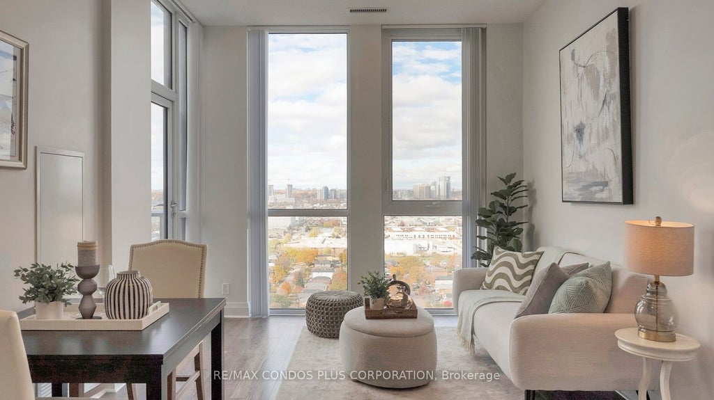 Penthouse suite with 10-ft ceilings, parking, and locker - enjoy stunning panoramic views of Toronto! This bright and inviting 1-bedroom condo features a brand new Samsung fridge and stove, functional living space, an open balcony, and parking included. The thoughtfully designed open-concept layout with floor-to-ceiling windows brings in abundant natural light, creating a warm and modern atmosphere perfect for professionals or first-time buyers. Located in a vibrant Etobicoke community surrounded by great amenities. Steps to The Queensway transit stop, restaurants, cafés, and shops, schools and just minutes to Mimico GO Station for an easy downtown commute. Enjoy nearby green spaces like Queensland Park and Ourland Park with playgrounds and open fields. Blending skyline views, modern finishes, and a penthouse address, this suite defines elevated urban living.